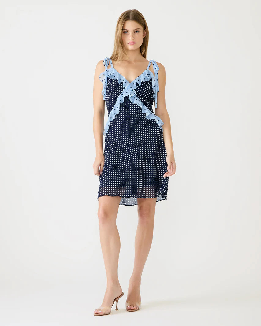 The Adalina dresscombines vintage charm with contemporary flair. This piece features playful polka dot detailing and delicate ruffle accents that create movement and dimension. The flowy silhouette drapes beautifully, while the adjustable straps with ties add an elegant, sophisticated touch. Perfect for occasions where you want to balance whimsy with refinement, this dress transitions effortlessly from day to evening wear.
