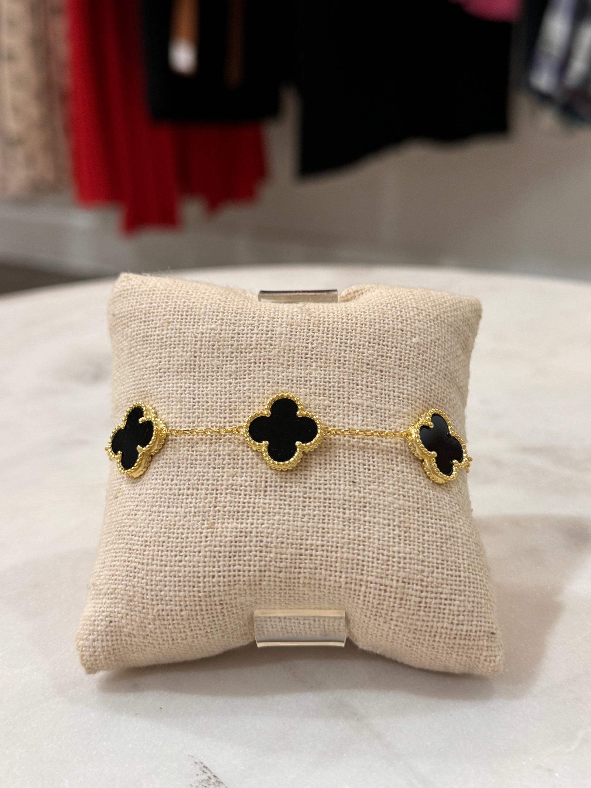 The Ali Five Clover Bracelet features five clover-shaped stones—onyx, mother of pearl, malachite, or lapis—set in a refined 14K gold-plated band. This bracelet combines timeless elegance with expert craftsmanship, making it a versatile accessory that enhances any outfit with subtle sophistication.