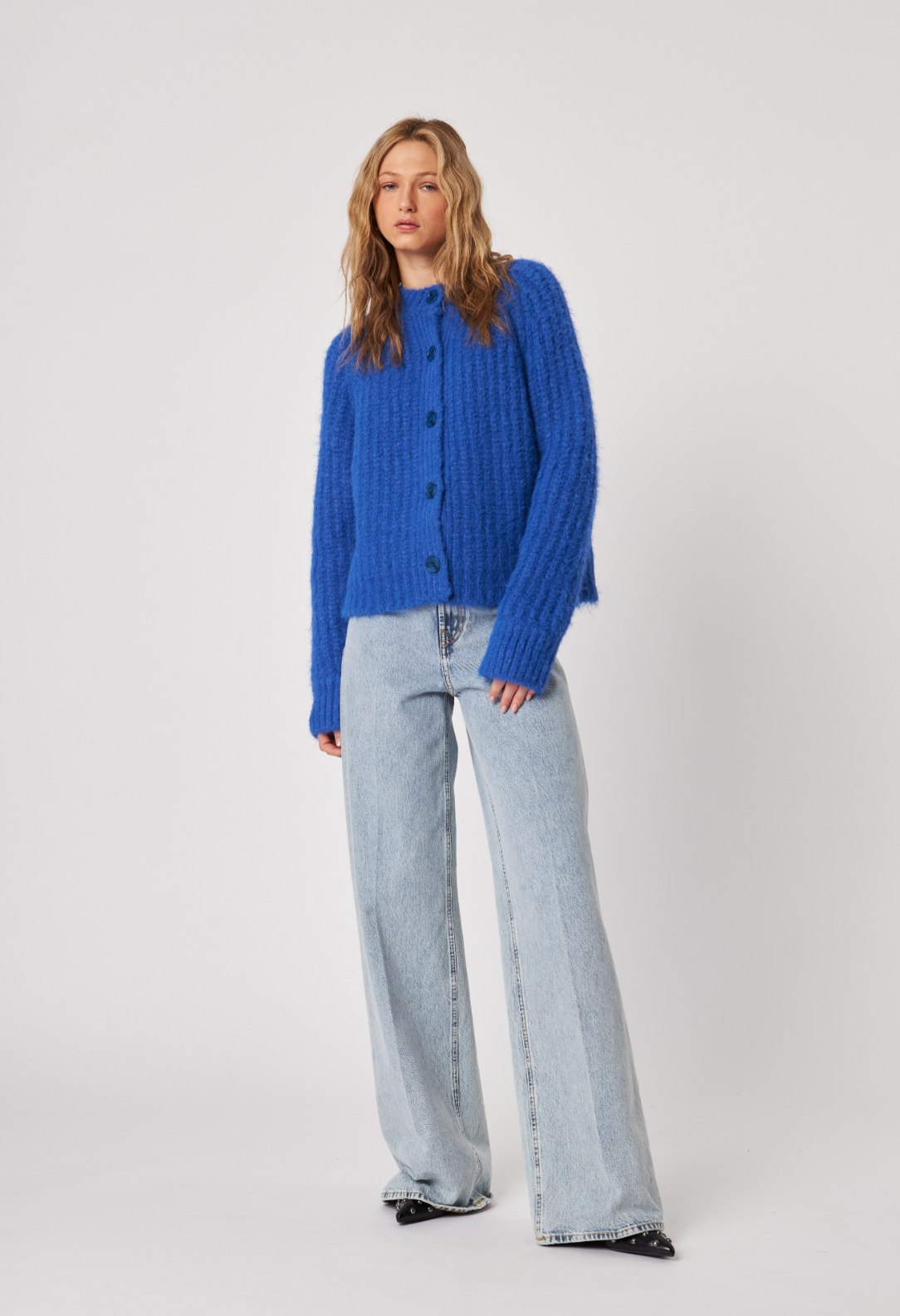Add a pop of vibrant color to your wardrobe with the Benny Electric Cobalt chunky knit cardigan. Made from a cozy blend of nylon, acrylic, polyester, wool, and a touch of spandex, it offers both softness and flexibility. Perfect for layering, this bright cobalt blue cardigan brings fun and warmth to any outfit, making chilly days feel a little brighter and more playful.