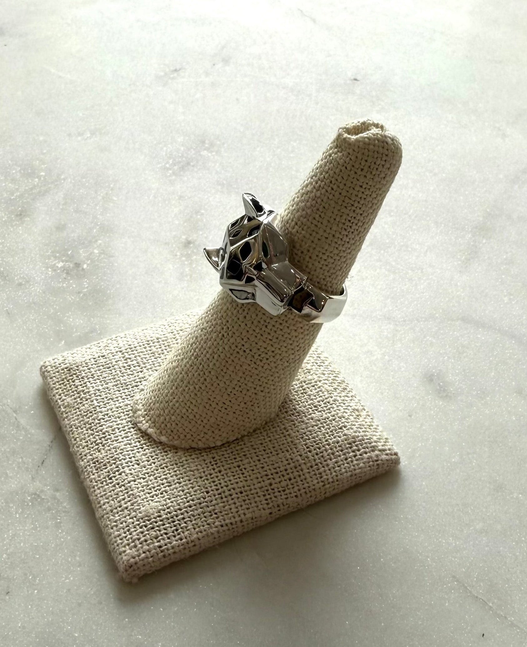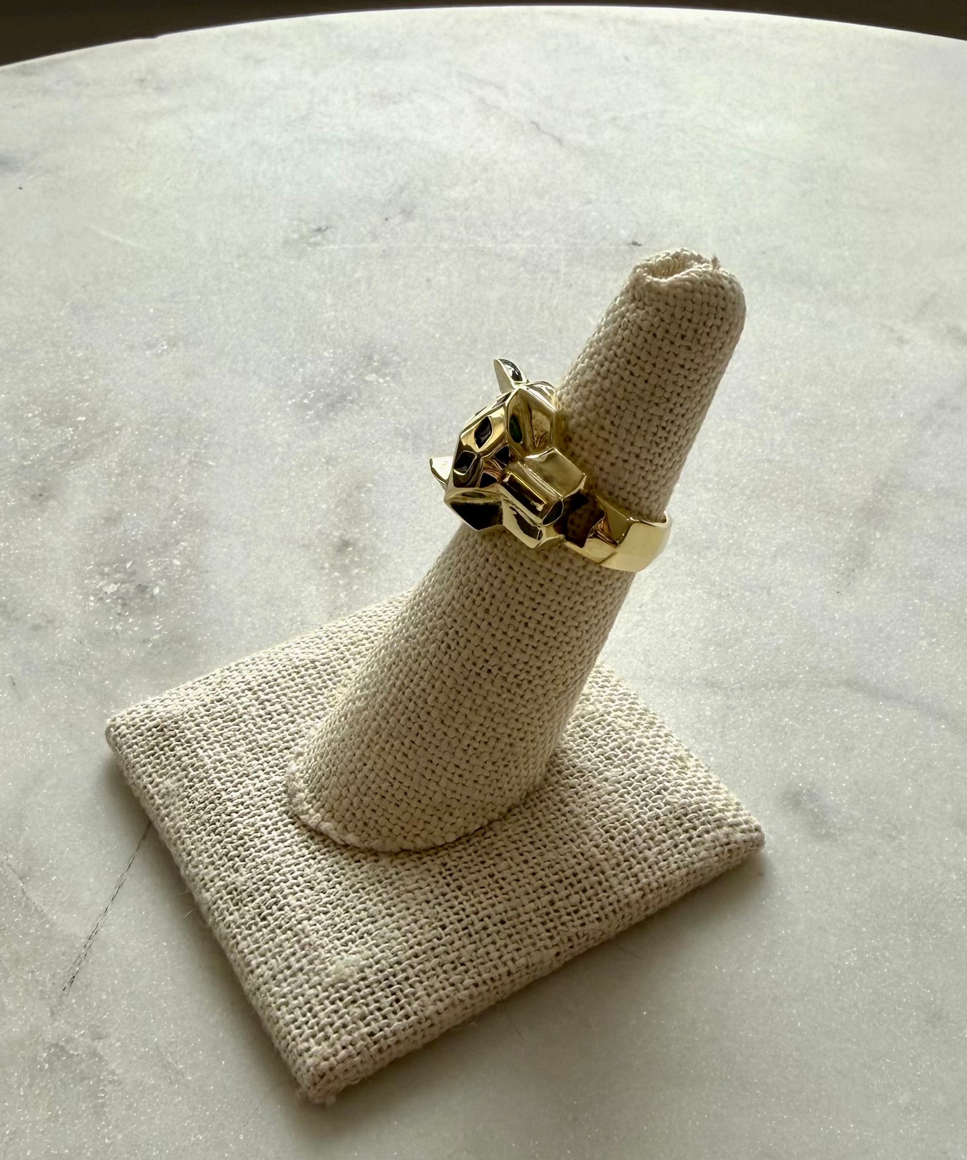 A bold statement ring featuring a striking cougar face design with luminous green stones set as eyes. This iconic piece captures feline grace and wild elegance, making it an unforgettable accessory for those who embrace distinctive style. Perfect for layering or wearing solo as a conversation-starting centerpiece.