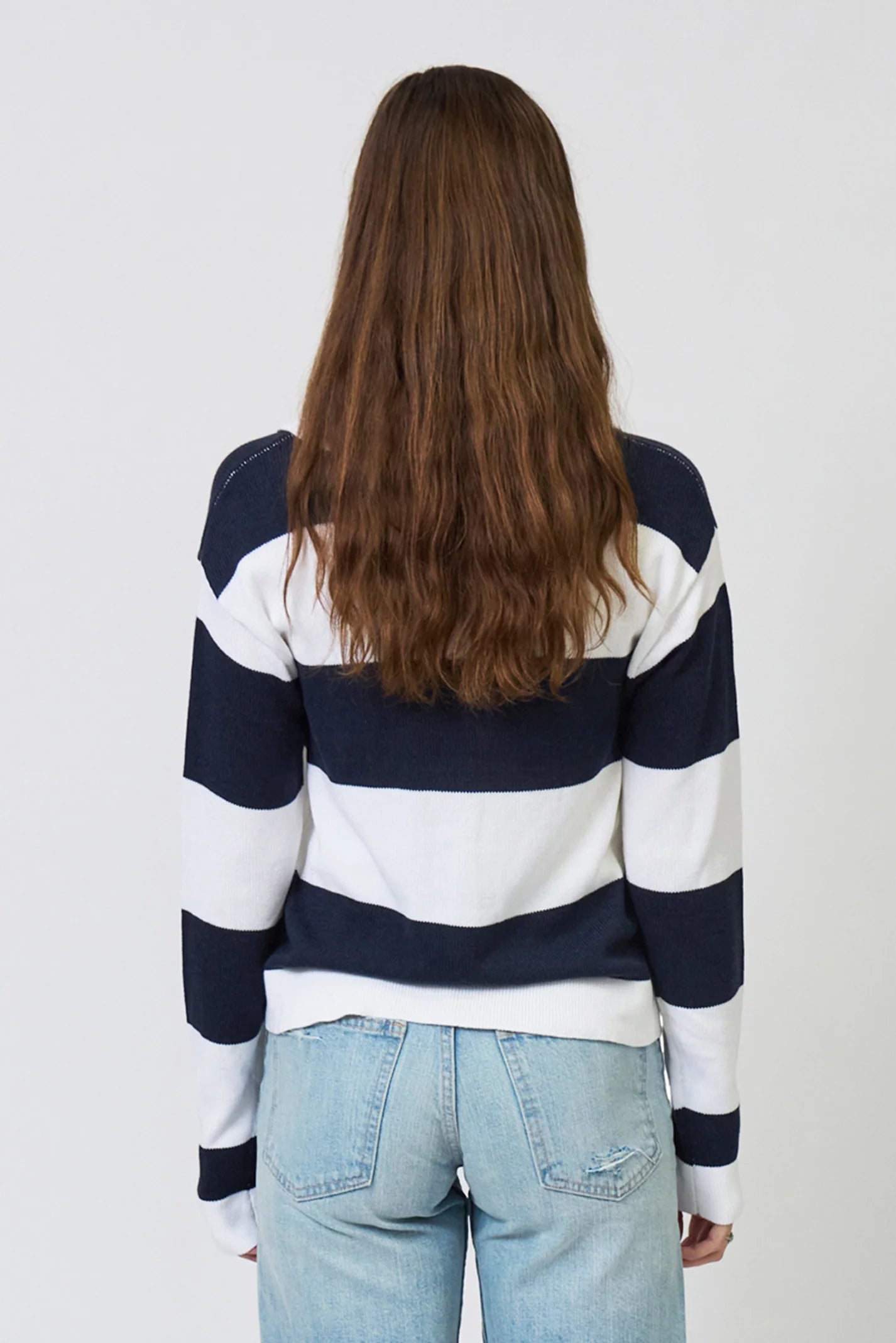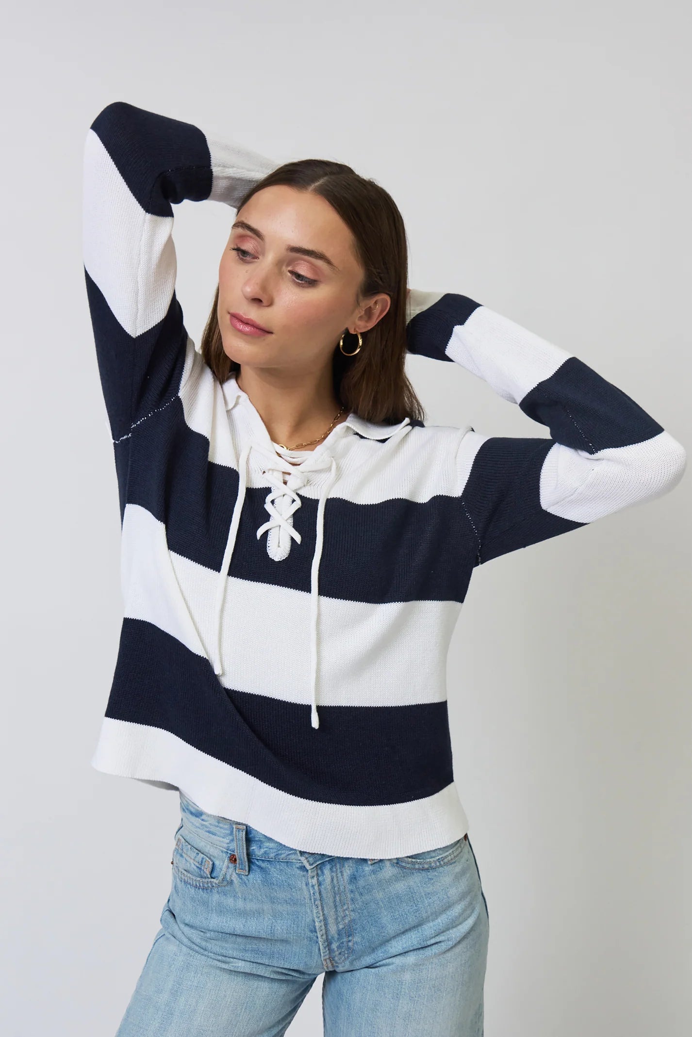 Bold horizontal stripes meet relaxed tailoring in this modern striped sweater. The lightweight knit keeps you comfortable while the lace-up front adds an unexpected nautical edge. Long sleeves, straight hem, and an easy fit that works with everything.