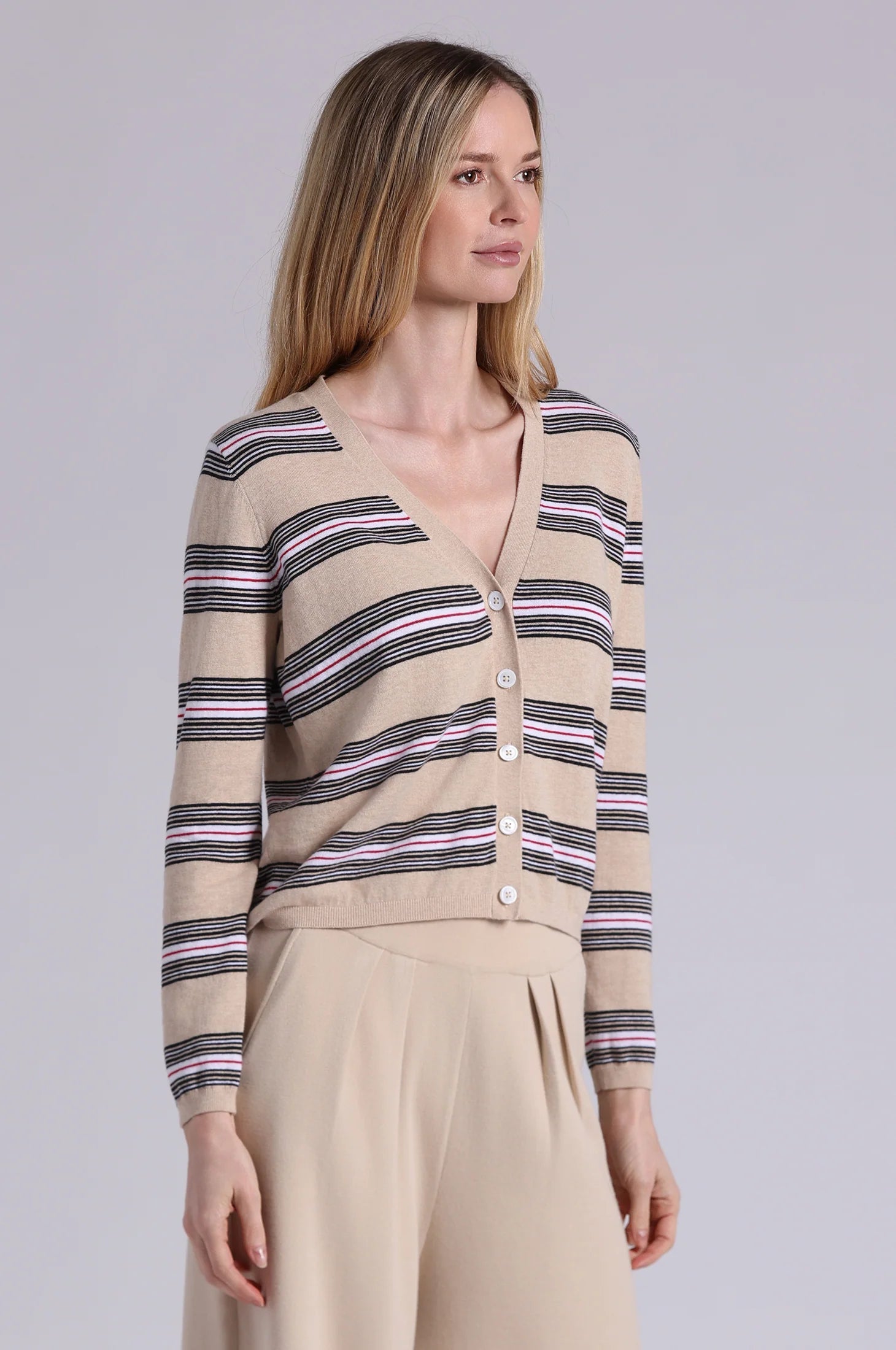 Lightweight cotton cashmere in brown sugar with delicate stripes and a refined V silhouette.
