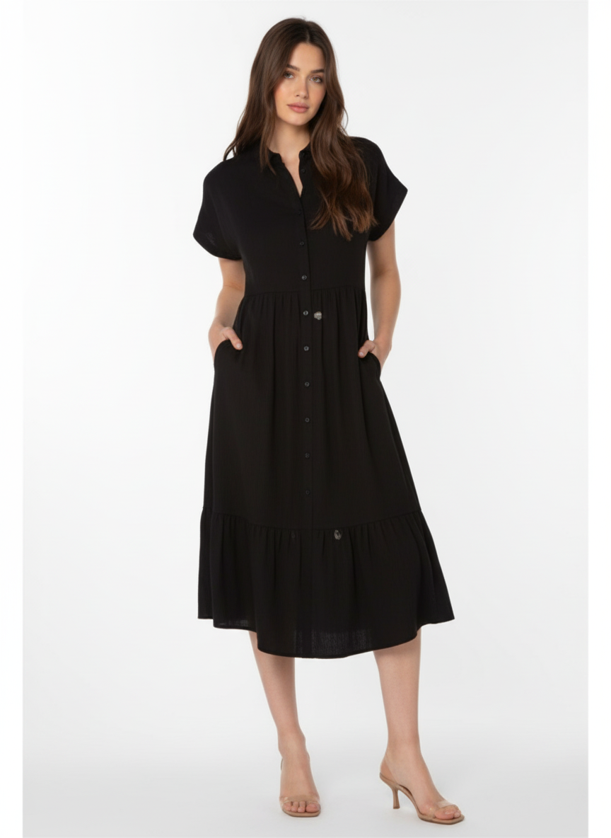 The Emily Black Dress is a sleek knee-length piece that hits all the marks. Fitted waist for definition, button-down front for easy styling, and a tiered hem. Effortlessly chic—dress it up or down.