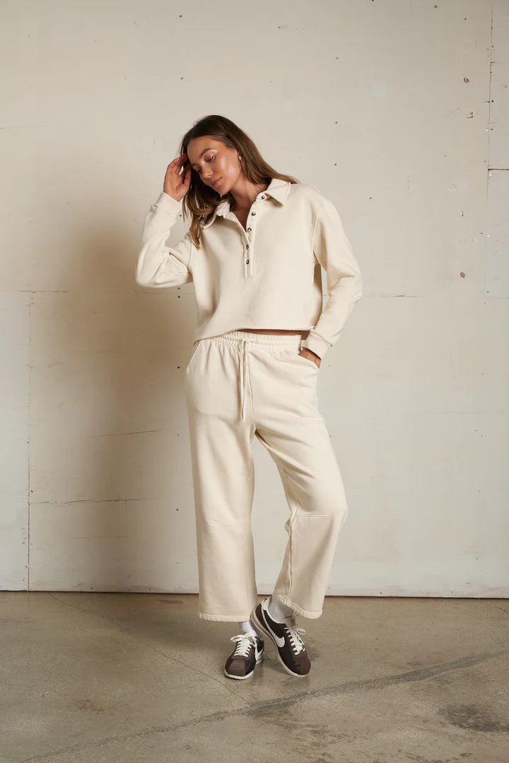 The vinny top is crafted from heavy fleece and finished with a raw hem for a relaxed, lived-in look. designed with a collared neckline and button placket, it brings a polished touch to a casual silhouette.
