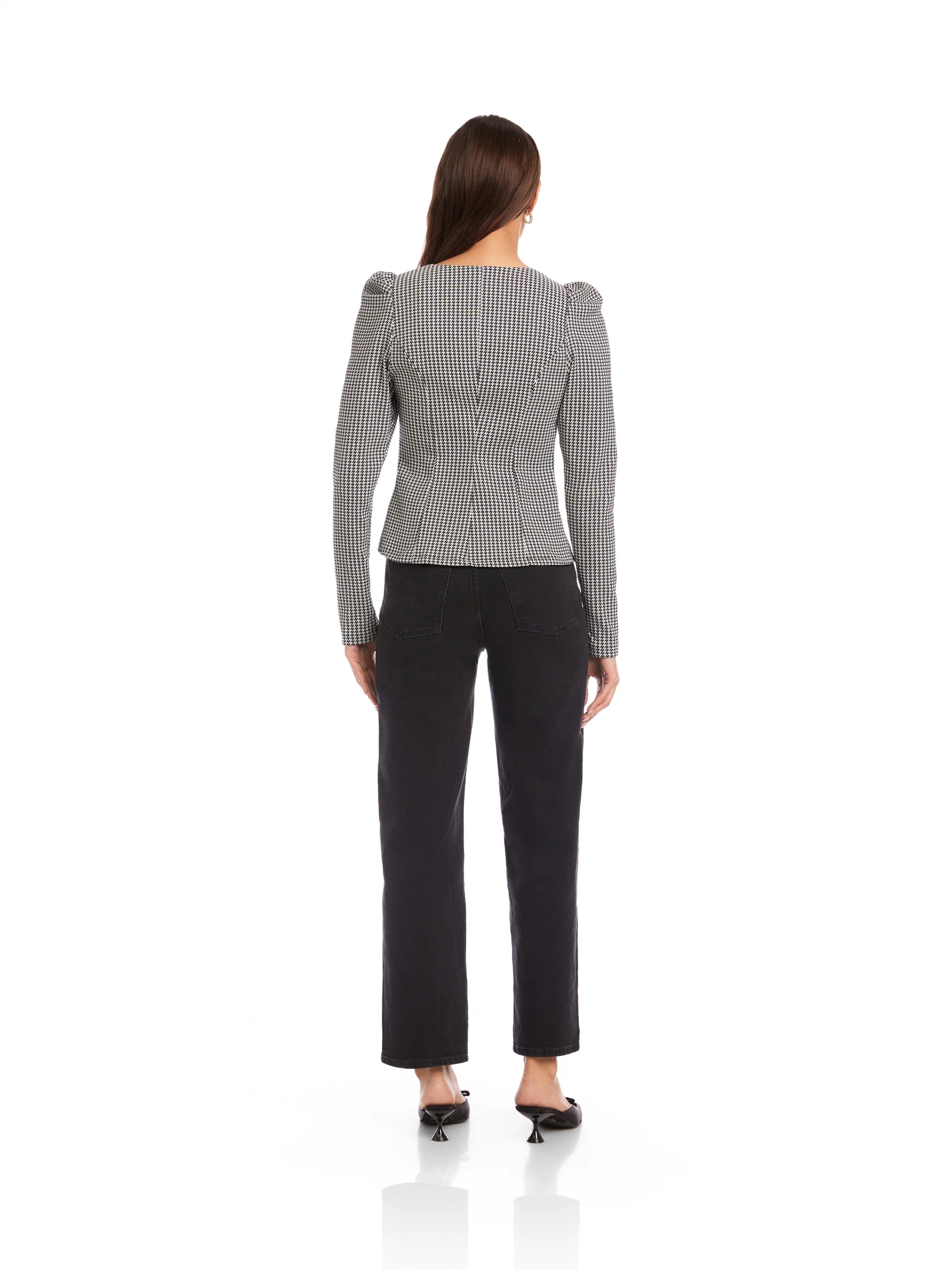 Designed with a feminine square neckline, long sleeves, and softly puffed shoulders that add just the right amount of volume, this top is crafted from a structured yet flexible houndstooth stretch woven fabric, offering both comfort and a polished look. A row of statement buttons brings classic polish, while the curved hemline creates a flattering, contoured finish.
