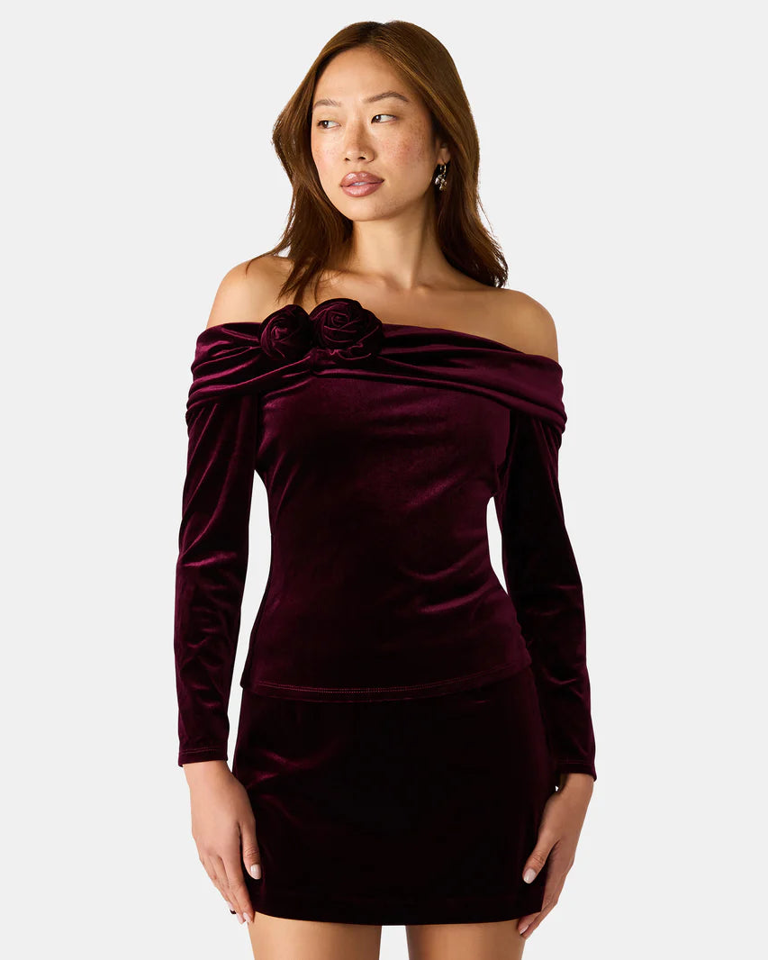 This LICI TOP WINE velvet top combines a flattering off-the-shoulder neckline with delicate rose decals for a refined, feminine look. Its long sleeves and tailored fit offer comfort and style, while the rich wine color adds warmth suitable for both casual and elegant settings. Crafted from 93% polyester and 7% spandex, it ensures stretch and durability.
