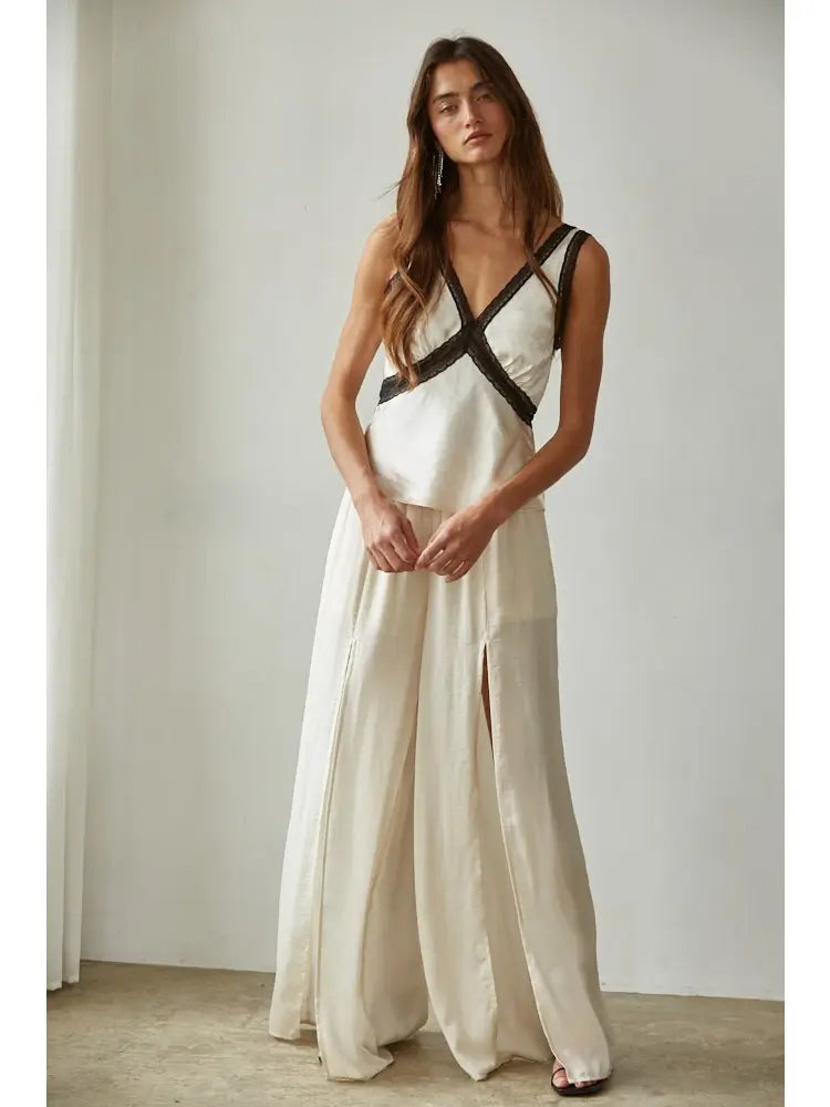 Woven Polyester Spandex Satin Contrast Lace Trim Detail Deep V-Neck Sleeveless Blouse Top with Side Zipper.