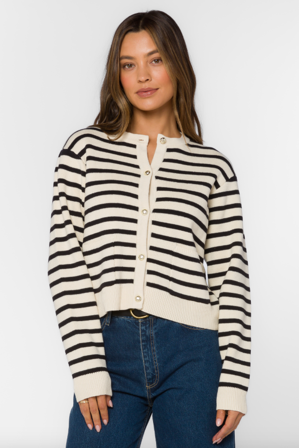 Add a fun twist to your wardrobe with the Melinda Stripe Cardigan. Featuring bold black and white stripes and charming silver buttons, this cozy piece brings playful elegance to any outfit. Perfect for layering, it adds a stylish pop whether you're dressing up or keeping it casual.