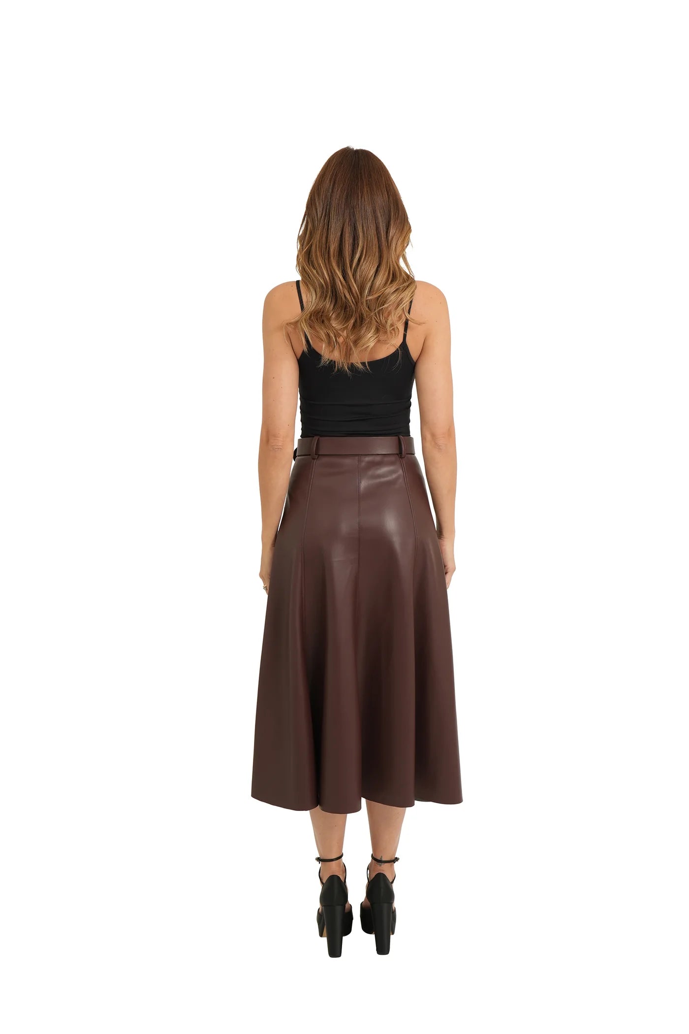 Mercedes faux leather swing midi skirt, paneled tulip skirt, faux leather belt w/ buckle, flare fit.