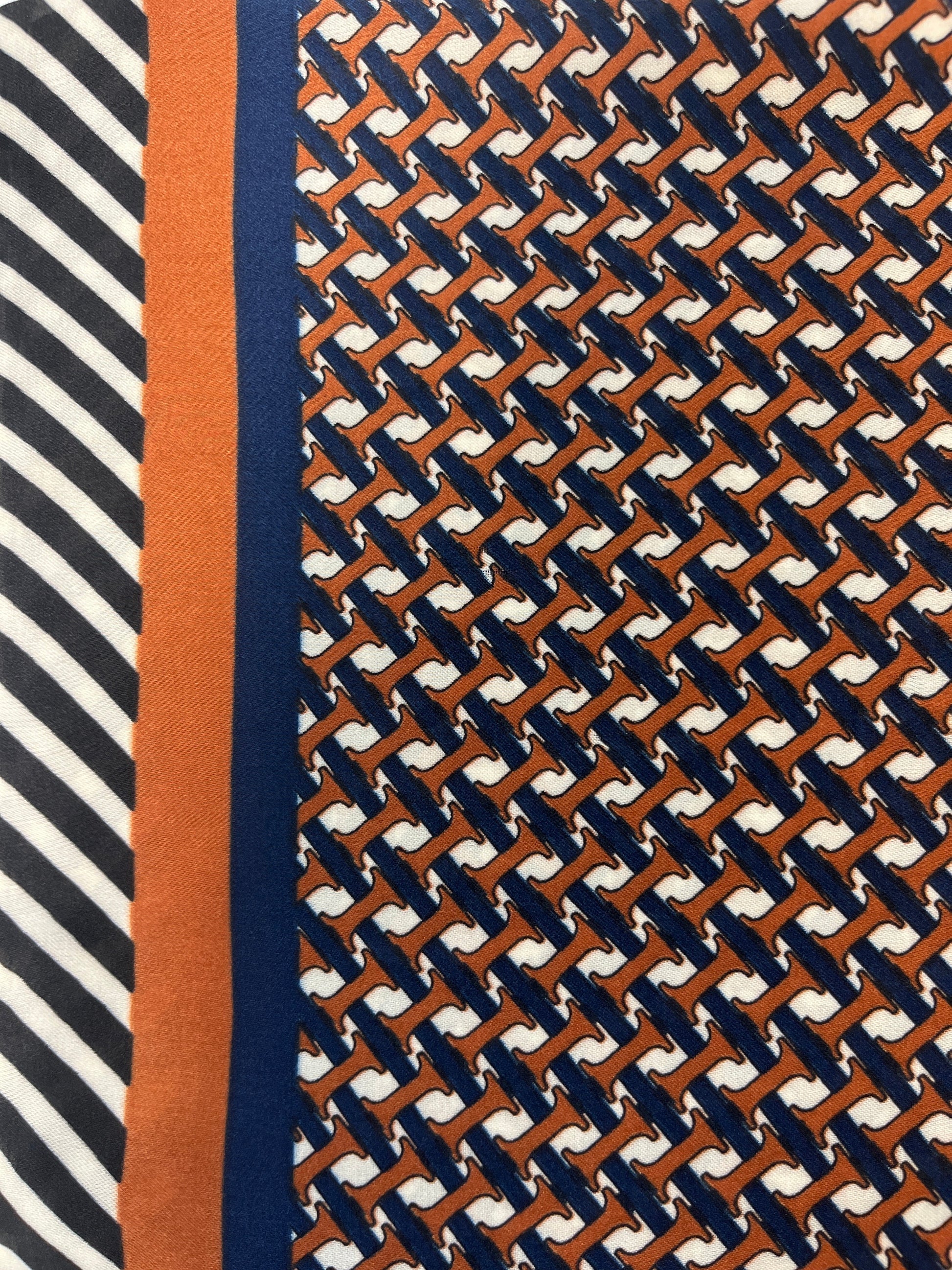 A vibrant geometric pattern featuring intricate, interlocking lines in various shades. The design combines contemporary style with a bold visual impact, making it a perfect accessory to add a touch of modern sophistication to any outfit.