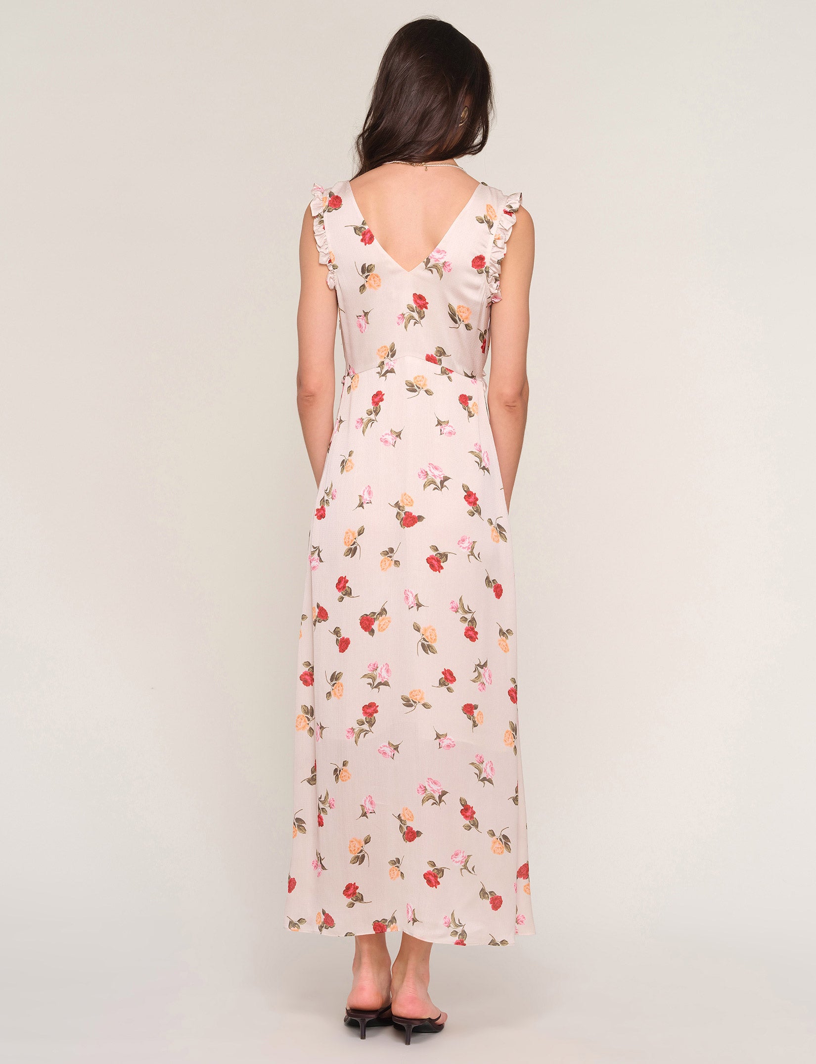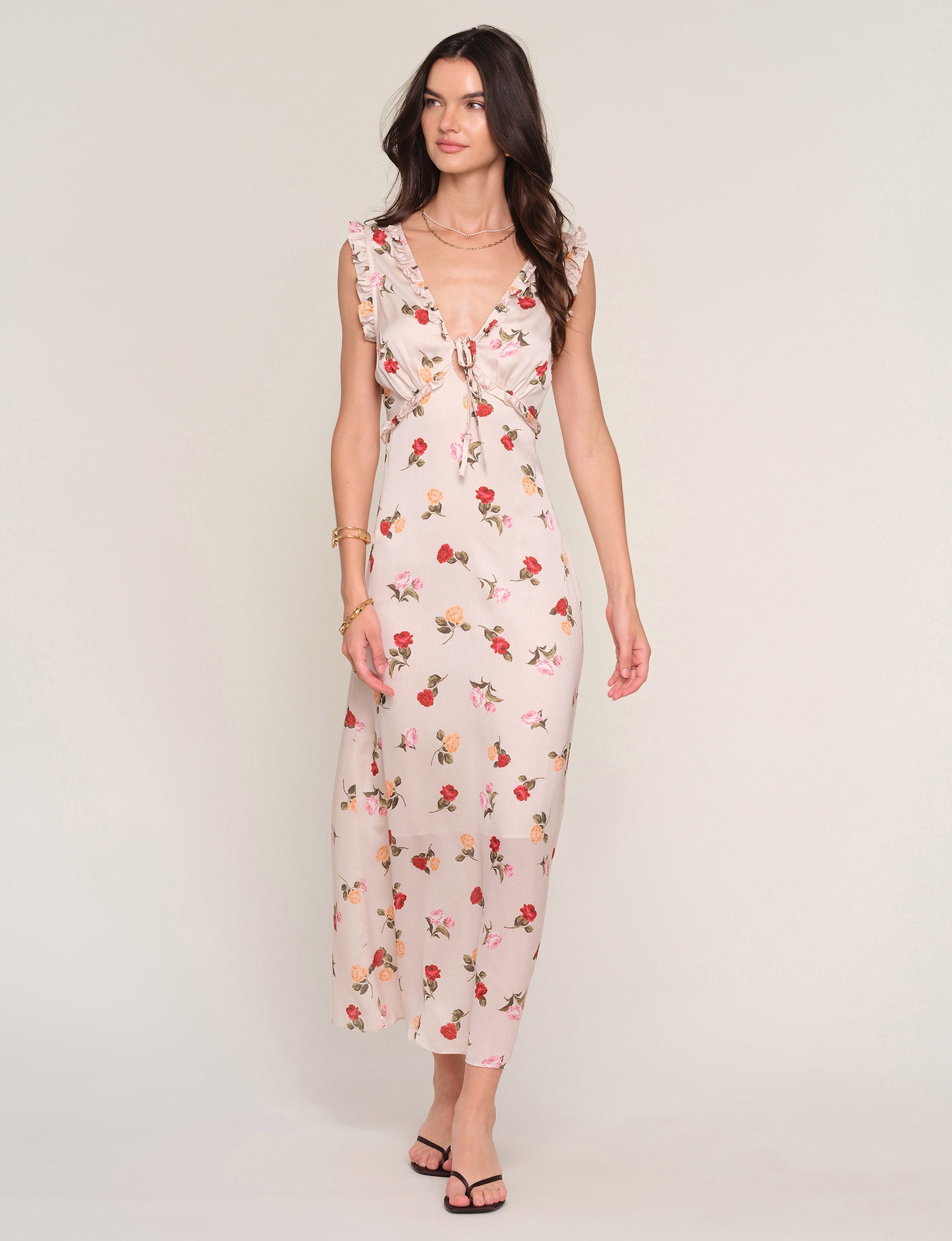 The Montana dress is where effortless elegance meets romantic charm in this slip dress. Delicate ruffles frame the neckline and armholes, creating a refined silhouette that transitions seamlessly from day to evening. The vibrant rose print brings a pop of color and personality, while the lightweight fabric drapes beautifully against the body. Perfect for layering or wearing solo, this piece captures understated luxury with a playful edge.