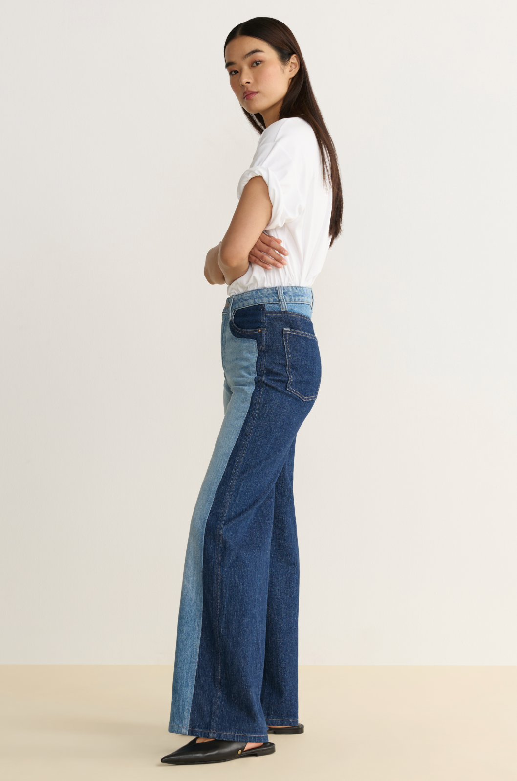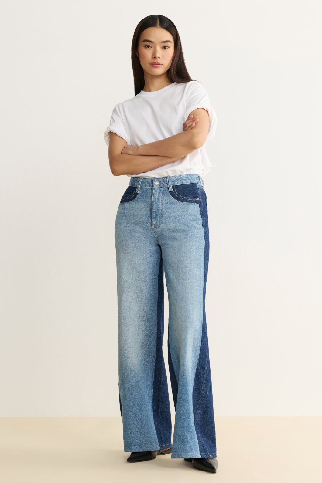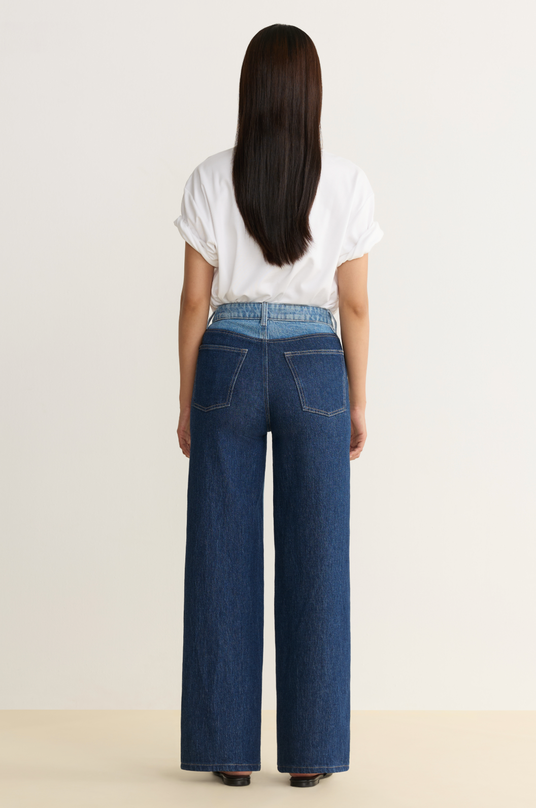 These wide-leg jeans blend a relaxed, high-rise silhouette. Featuring a unique light wash front contrasted by a dark denim back panel, pocketing, and waistband. Classic stitching and silver hardware complete the clean, polished look, making these jeans versatile for both casual and refined outfits.