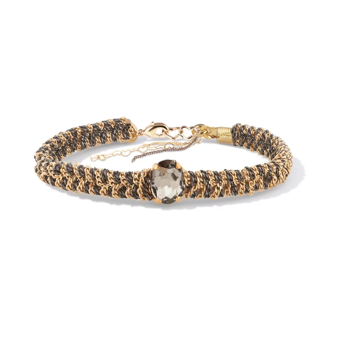 Fine hand-braided chains, colored threads and cubic zirconia setting. 24-karat gold plated on a brass base closure with carabiner. Semi Lunaire jewelry is designed and crafted in a workshop near Lyon. We often produce made-to-order pieces and therefore maintain a limited stock. The plating is done exclusively in France or Europe.