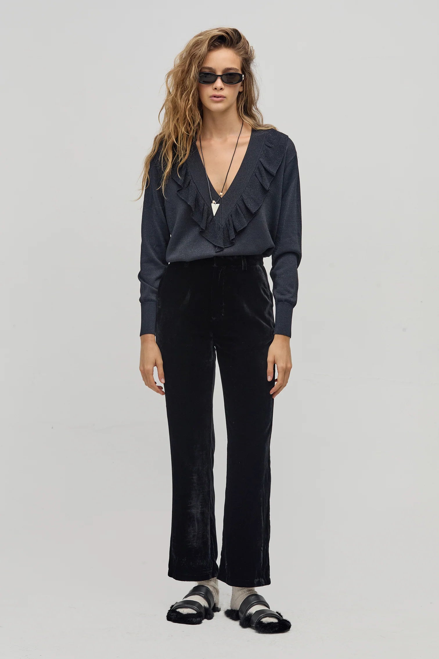 Gorgeous no matter how you look at it, the Boho Sweater is the piece that will save your winterโand your whole year, really. It's feminine, incredibly comfortable, and versatile, making it perfect for any occasion, whether you're heading to the office or getting dressed up for a night out. Plus, it can easily be worn by itself as a top because our lurex is very soft against the skin. The deep V-neck and ruffled detailing give it a romantic flair that always adds a beautiful touch and is universally flattering.