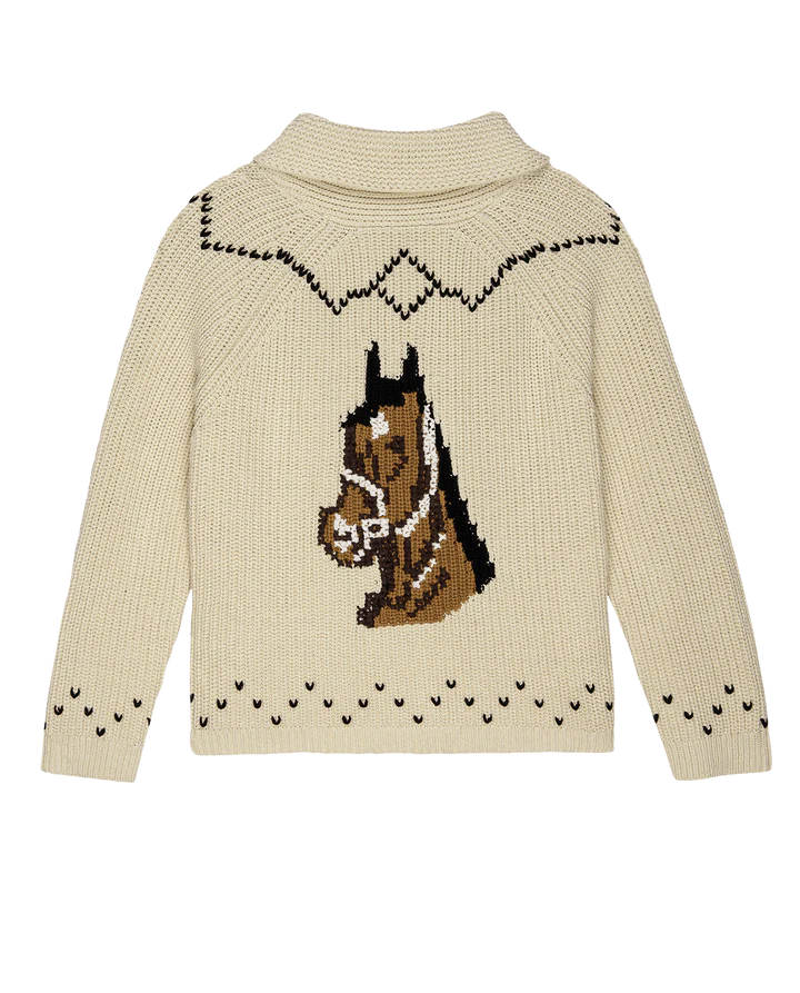 Inspired by a 1960s kids' sweater, The Horse Lodge features hand-embroidered horses on our best-selling Lodge Cardigan. Spun from a soft cotton blend yarn, this cozy piece beautifully blends western nostalgia with everyday comfort.